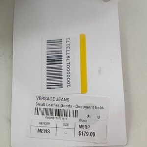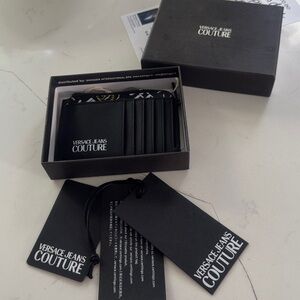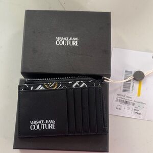 Stylish new with tags card holder from Versace Jeans Couture with tags and box. Features a sleek black design with white and gold accents. Perfect for organizing cards with elegance. Make sure to check out all the pictures for condition and measurements. Plus, it comes from a home where pets and smoke are never an issue. Last picture show one of the dent of the zipper closure is missing and price reflects this issue. Bundle for a special discount and shipping. This item is non returnable. Accepts reasonable offers. Thanks for checking my closet.