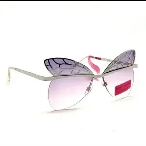 Edgy Betsey Johnson rimless butterfly sunglasses with Silver-tone wings. Iconic Betsey Johnson pink heart at tips of arms.