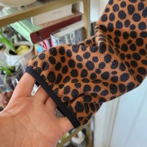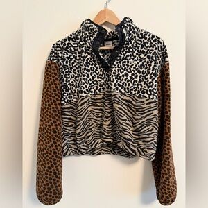 Bold animal print jacket. Features mixed patterns. Stylish and unique design.