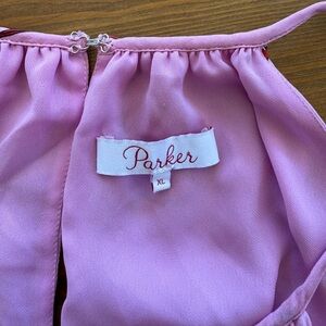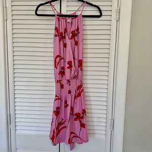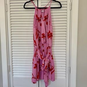 A draped floral mini dress with a keyhole cutout to reveal a hint of skin at the neckline.