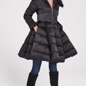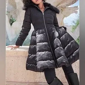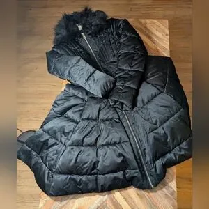 Elegant black puffer coat. Features faux fur trim. Stylish and warm.