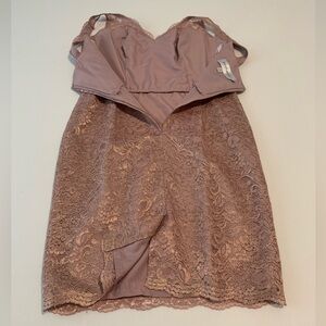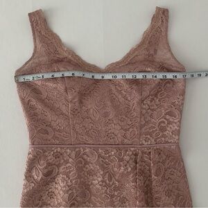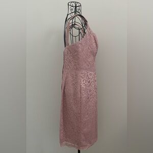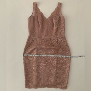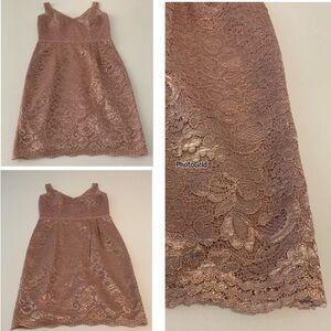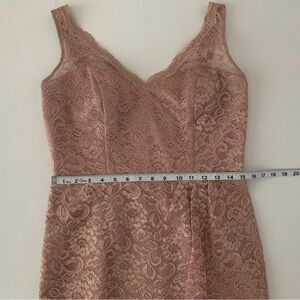 Brand new, never worn. No tags. Color is “Rose Gold Metallic” per garment tag. This is a pink shade with gold metallic detail throughout the lace design which shows up best in closeup pics with overhead light on. Some photos taken in natural lighting, no overhead light, to show the difference in color and sheen depending on lighting. Picture #15 shows no light on in top left pic, light is on in the other 2 pics. Labeled Size 10, fully lined, no stretch. Please see pictures for approximate flat measurements and your best fit. Modeled Covershot is for fit purposes only and is not the actual dress for sale; all other pictures are the item you will receive.