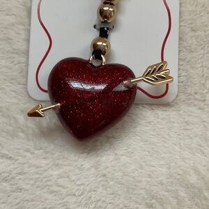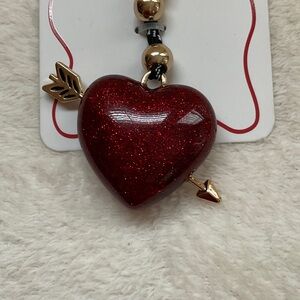 Elegant bag charm featuring a red heart with gold arrow. Accented by gold beads and clasp.