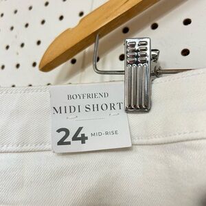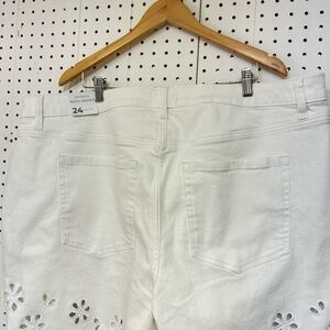 Lane Bryant Eyelet-Hem Boyfriend Fit Jean Shorts in white denim. They feature a mid-rise fit, a 5.5" inseam, and a relaxed cut through the hip and thigh.