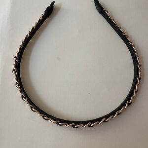 This chic headband features a stylish black band adorned with a gold chain detail, perfect for adding a touch of elegance to any outfit.