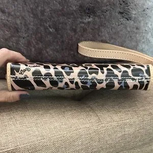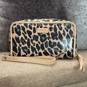 Chic Consuela wristlet with bold leopard design. Features black and tan pattern. Perfect for essentials. Like new condition.