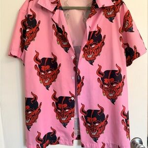 Vibrant pink shirt with bold red devil design. Eye-catching and unique style.