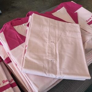 100% cotton light pink custom Rare Beauty Bowling Shirts with hot pink trim. Multiple available. All size small. New without tags