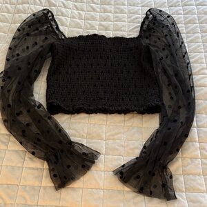 Forever 21 Black Smocked Top with Sheer Polka Dot Sleeves
