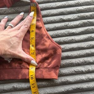 Darc Sport Everson Seamless halter sports bra in the Canyon Rust Marble colorway. Features a flattering halter-style neckline with a seamless, very stretchy fabric and flexible fit. These halter styles are known to have more give compared to traditional sports bras. Tags and bra pads have been removed for comfort. Estimated to fit a size small or medium. Measurements are shown in photos for reference.