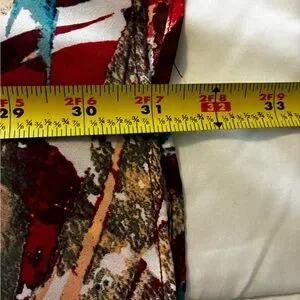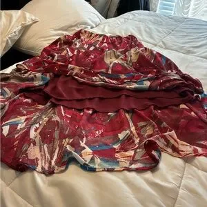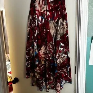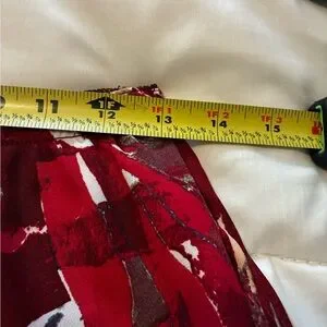 Elevate your wardrobe with this stunning abstract red and blue skirt. Perfect for any occasion, this skirt offers a vibrant and stylish look. Elastic waist than can be let out! I’ve wore this skirt one time they do not look good on me! Polyester Blend. Lined Full
