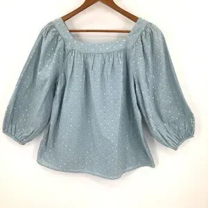 Lauren Conrad Women's L Light Blue Silver Cotton Puff Sleeve Square Neck Top
