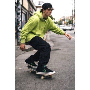 These Converse Cons Gates Mid sneakers feature a sleek black suede upper with bold green accents for a classic skate inspired look. Designed for durability and comfort, this mid top silhouette offers ankle support, cushioned insoles, and a grippy rubber outsole. A versatile streetwear staple that works effortlessly with casual, skate, and everyday fits.