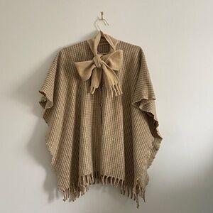 A cozy, heirloom-feel layer that reads equal parts artisan and alpine. Handwoven from 100% new wool in a soft oat-and-camel weave, this cape drapes beautifully with natural structure and warmth without bulk. The silhouette falls in an easy, swingy shape with fluid movement through the arms, finished with rustic wooden buttons and a generous tie at the neck for that storybook, countryside charm.