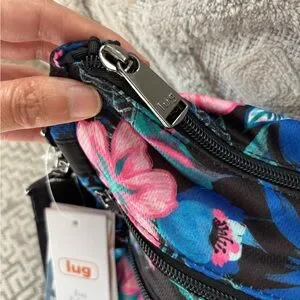 Top zip closure, adjustable/removable crossbody strap, two front zip pockets, back zip pocket