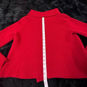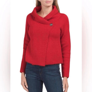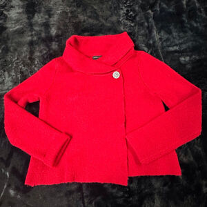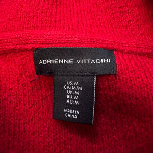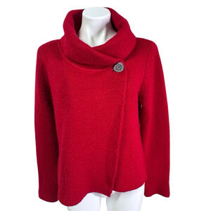 Adrienne Vittadini cardigan sweater in red, size Medium. Features a cowl neck and a wrap-style front with a single decorative black button closure. Material: 48% Acrylic, 25% Polyester, 23% Wool, and 4% Spandex/Elastane. Chest (Width): 19.5 inches; Length: 20 inches. No visible imperfections.