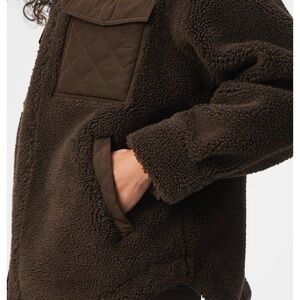 Stay cozy with this chocolate teddy jacket. Features quilted pockets and plush texture.