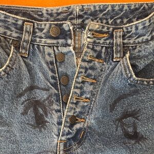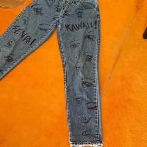 Stylish blue jeans featuring unique hand drawn graphic designs. Perfect for a trendy and bold look.