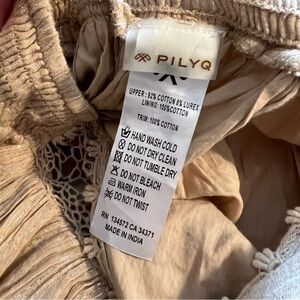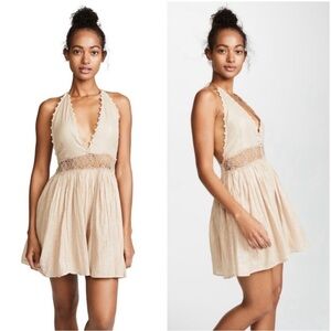This flirty PilyQ mini dress is detailed with shimmering metallic pinstripes. A sheer lace inset reveals a peek of skin at the waist. Slim, tasseled halter ties. Lined.