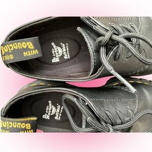 Stylish black platform loafers. Durable leather construction. Iconic yellow stitching. A few scuffs on front- easily covered with shoe polish.. or leave. Hardly noticeable (as seen in photo)