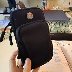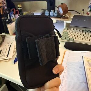 Keep your phone secure during workouts with this sleek black armband phone holder. Perfect for fitness enthusiasts.