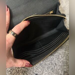 Exterior slip pocket, interior slip compartment, interior zip compartment, interior zip pocket, interior bill slot, six interior card slots