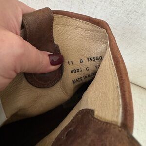 Frye slip on ankle booties with small heel. Distressed brown leather boots as shown by pictures. Brown color varies given material.