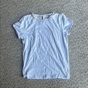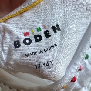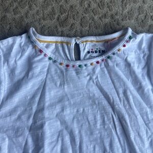 100% cotton Ali puff sleeve pom top from Mini Boden. Girls size 13-14Y. New with tags. White with pom trim on the neck and sleeves. Has a button at the back neck. Perfect for back to school! I have some coordinating Mini Boden shorts for sale as well.