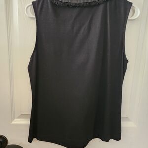 Discover elegance with this black sleeveless blouse, featuring a satin trim and delicate ruffle accents. Perfect for adding a touch of sophistication to any outfit.