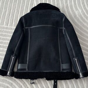 Sleek black shearling jacket. Features zip details and buckle accents. Ideal for stylish warmth.