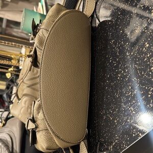 Description : Tan, cotton linen lining, exterior: 2 side bags with buckle and extra magnetic buckle, top handle, adjustable shoulder straps with padded mesh backing.