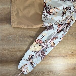 Columbia jacket featuring a floral design. Hooded style with tan base. Ideal for casual wear.