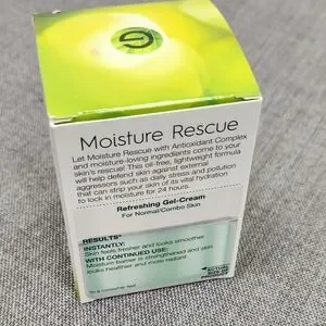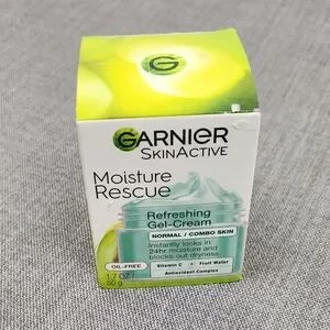 Experience the refreshing hydration of Garnier SkinActive Moisture Rescue Gel-Cream. This green gel-cream locks in moisture for 24 hours, perfect for normal to combo skin. Infused with Vitamin C and fruit water, it revitalizes and protects your skin.