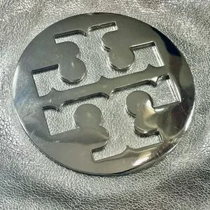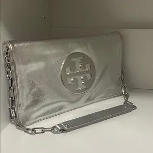 Chic metallic silver clutch with iconic TB logo. Features a stylish removable chain strap. Perfect for evening/cocktail/prom occasions. Clean makeup free interior.