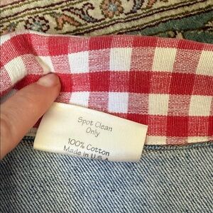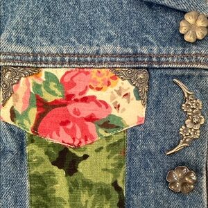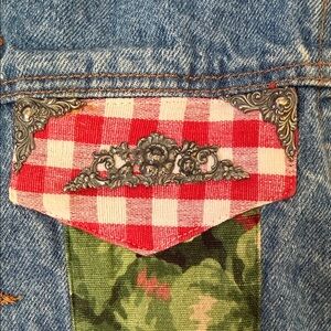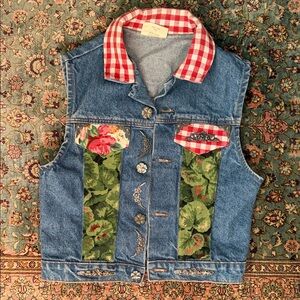 Hand made 100% cotton denim vest featuring floral patterns and red checkered accents. Perfect for layering or as a statement piece.