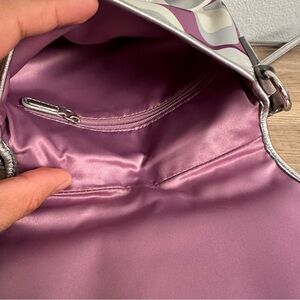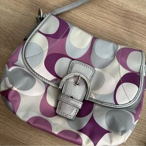 Coach Soho Signature Scarf Print Buckle Flap Swingpack mini Crossbody bag in purple, silver, and cream sateen with metallic silver leather trim.