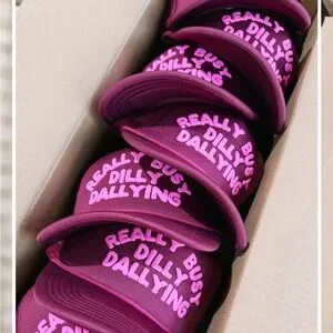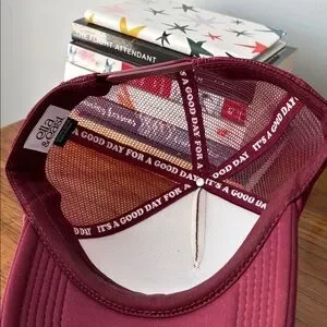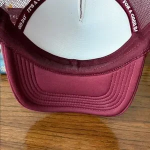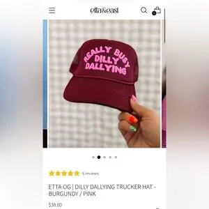I’m so obsessed with this hat!! I love love the puffy pink lettering on the burgundy hat. And of course, I’m always dilly dallying. Unfortunately, it’s just a little big for my head. I wore it once and there is very slight makeup marks inside- as pictured. *smoke free home*