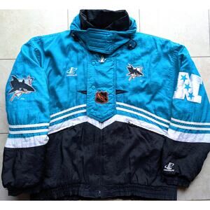 San Jose Sharks 90s Logo ATHLETIC puffer jacket Spellout XL teal white NHL hockey retro vintage