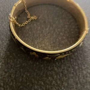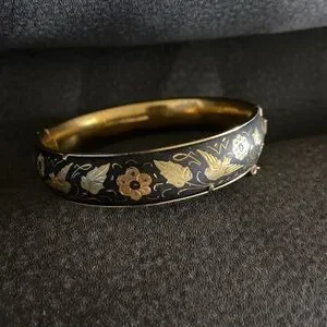 This elegant bangle features a stunning black and gold floral design. Purchased in Spain.