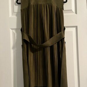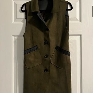 Stylish dark olive vest with sleek black trim. Features button closure and front pockets. Ideal for layering.