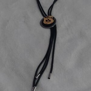Chic necklace featuring a leopard print pendant. Multiple black cords add elegance.