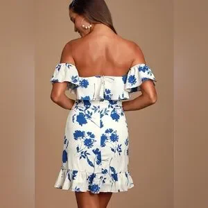 Lulus Exclusive! Turn heads when you walk in wearing the Lulus Talia White Floral Print Off-the-Shoulder Mini Dress! This cute woven mini dress, decorated in a pretty blue floral print, drapes from elasticized, off-the-shoulder sleeves into a double ruffled neckline (with no-slip strips) and darted bodice. Fitted waist sits atop a flirty mini skirt with a ruffled hem. Hidden back zipper/clasp.