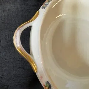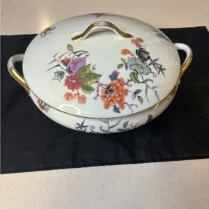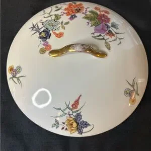 Elegant floral porcelain covered dish featuring vibrant colors and gold accents. Perfect for enhancing your dining experience. This dish is made of German fine China porcelain.