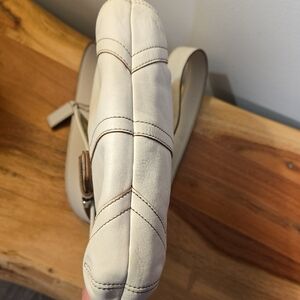 Chic Coach crossbody in soft beige leather. Ideal for daily wear with a sleek buckle detail. Adjustable strap instructions included! Strap adjusts to shoulder strap size. Measurement photo shows crossbody length. I purchased this bag new many years ago from Coach retailer. It is in great shape but please note photos for condition and wear. Main call out is slight color transfer mark from wear on back of bag. Definitely not noticeable when carrying.