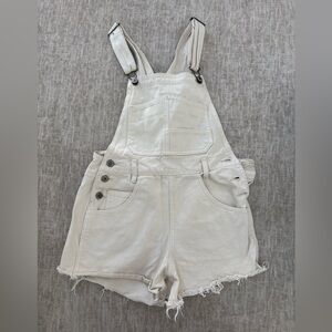 Chic and comfortable white denim overall shorts, perfect for casual wear. Features adjustable straps and a stylish design.