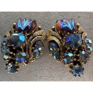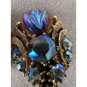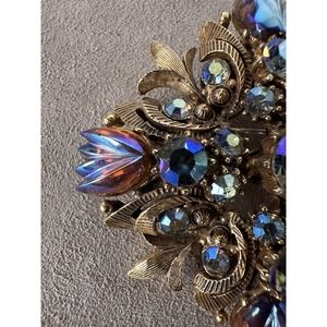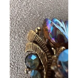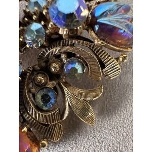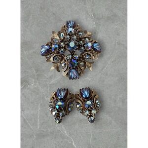Vintage brooch and clip-on earring set in good, wearable condition. All pieces show age-appropriate wear with light surface patina and minor oxidation on the reverse sides, particularly near the clip mechanisms and brooch pin. The metalwork remains structurally sound, and all closures function securely. No missing stones or visible damage on the front-facing design. Please review all photos for close-up condition — natural signs of age enhance the vintage character of this beautifully crafted set.