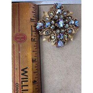 Vtg Florenza Gilt Maltese Cross Blue Borealis Brooch & Earrings Set Signed