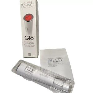 The reVive Light Therapy Glo is a popular device designed for anti-aging and wrinkle reduction. It uses multi-wave LED technology, combining red, infrared, and amber light to help reduce fine lines, wrinkles, and improve skin firmness and elasticity. The device is portable and can be used daily for just a few minutes. Product is new and unused.