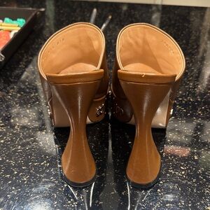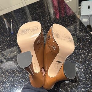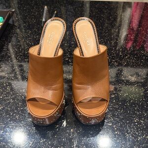 This is an authentic pair of GUCCI Malaga Kid Janaya 150mm Platform Sandals size 37,5 These stylish pumps are crafted of brown calfskin leather. They feature silver GG logos, rounded toes, 1.75-inch platforms, and 5.5 inch heels. Worn once. Wear marks shown. Box including.