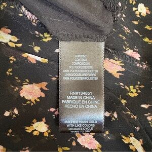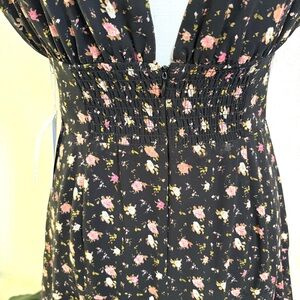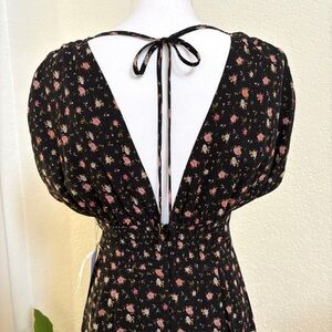 New with Tags WAYF Black Floral Ditsy 3 Tiered Flowy Maxi Dress. Fitted bustier, V neckline, ties at back neckline, back zipper. Side Slit Left Leg, Interior Lining. Size small